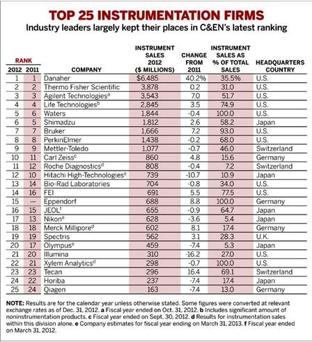 2013年4月29日,最新一期C&EN雜志的封面文章揭曉了2012年全球儀器公司排名前25的名單。C&EN自2010年開始發(fā)布全球儀器公司排名,今年是第四次發(fā)布。在今年揭曉的2012年全球儀器公司排名前25名單中,排名前十情況與2011年變化不大,排名第一為丹納赫(Danaher),排名第二為賽默飛世爾科技(Thermo Fisher Scientific),排名第三為安捷倫(Agilent Technologies)。其中,排名發(fā)生變化的是:島津(Shimadzu)降至第六位;沃特世(Waters)升至第五位;日立高新(Hitachi High-Technologies)跌出了前十,卡爾蔡司(Carl Zeiss)升至第十。詳細名單見下: